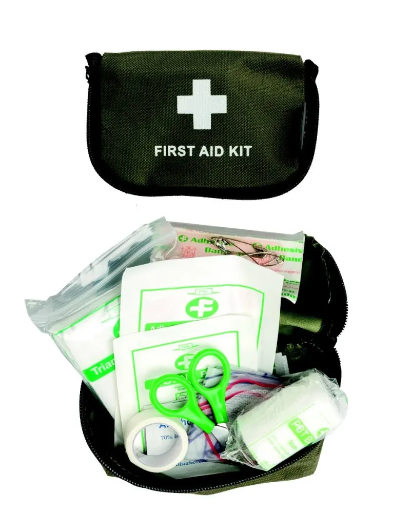 - ножницы - английские булавки (4 шт.) - лейкопластырь (5 полос) - спиртовые тампоны для обработки ран (4 шт.) - влажные гигиенические салфетки (4 шт.) - бинт марлевый: 50х45 мм - стерильные марлевые накладки на рану: 50х50 мм (2 шт.) - стерильная клейкая накладка на рану: 100х100 мм - косынка медицинская: 960х960х1350 мм - медицинская маска. Корпус: 100% полиэстер Размеры: 14 х 9 х 5 см Вес: 80 г