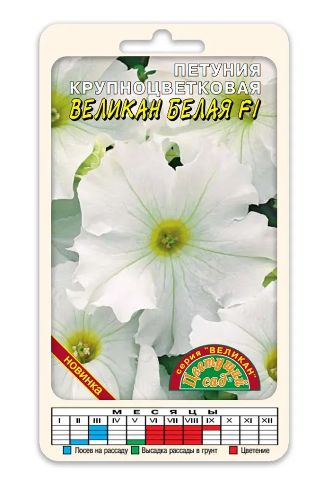 ПЕТУНИЯ КРУПНОЦВЕТКОВАЯ Великан Белая F1 Новый крупноцветковый гибрид. Растение компактное, высотой не более 15-25 см, усыпанное крупными, оригинально окрашенными цветками, достигающими в диаметре 10-12 см. Петуния идеально подходит для групповых посадок, балконных ящиков, вазонов и цветочных горшков. Она неприхотлива, отлично чувствует себя даже в условиях большого города и будет радовать Вас пышным цветением весь сезон! Агротехника Выращивается рассадным способом, семена при этом лишь слегка присыпают легким грунтом или производят посев под стекло. В грунт рассаду высаживают, когда минует угроза заморозков. Петуния предпочитает богатую питательными веществами супесчаную почву на солнечном месте. Полив умеренный, так как петуния не переносит переувлажнения. При выращивании рассадой для получения хорошего результата по всхожести и росту рассады, применяйте торфяные таблетки. *Дизайн упаковки может быть изменён.