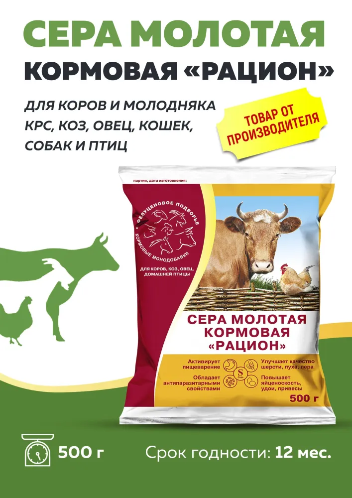Сера кормовая натуральная высокой очистки используется для коров и молодняка КРС, коз, овец, кошек, собак и птиц, как один из основных компонентов кормовых и лечебных смесей. Кормовая добавка по внешнему виду представляет собой порошок с различными оттенками желтого цвета, которая: В кормлении Крупного Рогатого Скота: входит в состав анионно- катионных специальных добавок для сухостойных коров увеличивает жирность молокаукрепляет копытный рог от растрескивания входит в состав инсулина , витамина В1 и Н( биотина) нормализует сахаропротеиновое соотношение в рационе животныхувеличивает среднесуточные привесы скота на 15% и молочную продуктивность на 10 -15% оказывает антипаразитарное и очищающее действие улучшает вкусовые качества молока и мяса. В кормлении Коз и овец: улучшает качество шерсти активизирует пищеварение и обмен веществ, нормализует теплообмен оказывает антипаразитарное и очищающее действие микроорганизмы рубца синтезируют аминокислоты , которые в последующем используются на синтез белков молока, а из молока изготавливают вкусные сыры укрепляет копытный рог , особенно у овец на пастбищном содержании и при пастьбе в горной местности . В кормлении Лошадей: применяют для укрепления, роста и восстановления волосяного покрова для улучшения качества, ускорения роста и укрепления копытного рога оказывает противопаразитарное действие. В кормлении Птиц: активизирует обмен веществ, повышает аппетит у несушек увеличивается яйценоскость улучшается качество перьевого покрова обеспечивает нормальную терморегуляцию"профилактирует расклев. СОСТАВ Сера кормовая. ДОЗИРОВКА И СПОСОБ ПРИМЕНЕНИЯ Ежедневно перед утренним кормлением суточную дозу серы кормовой (указанные в таблице ниже) смешать со свежеприготовленным кормом. Добавлять только в охлаждённый корм. ОСОБЫЕ УКАЗАНИЯ Кормовая добавка не является самостоятельным кормом, это добавка к основному рациону. Не рекомендуется скармливать молодняку в молочный период. Компания ""Капитал-ПРОК"" реализует только оригинальную продукцию, что подтверждено всеми необходимыми документами согласно законодательства РФ. Остерегайтесь подделок. УПАКОВКА Продукт упакован в индивидуальные пакеты из полимерной пленки, масса 500г (в одной коробке 18 штук) УСЛОВИЯ ХРАНЕНИЯ Хранить продукт отдельно от пищевых продуктов в сухом и прохладном помещении, при температуре не выше 25°С и влажности не более 75%, вдали от источников огня. Срок годности при соблюдении условий хранения - 12 месяцев. ПОБОЧНЫЕ ДЕЙСТВИЯ Данный продукт изготовлен из натуральных природных компонентов. Не содержит антибиотики, стимуляторы роста, гормональные препараты и ГМО. Побочных явлений и осложнений при применении продукта выявлено не было, противопоказаний не установлено. Продукцию животноводства после применения продукта можно использовать в пищевых целях без ограничений."