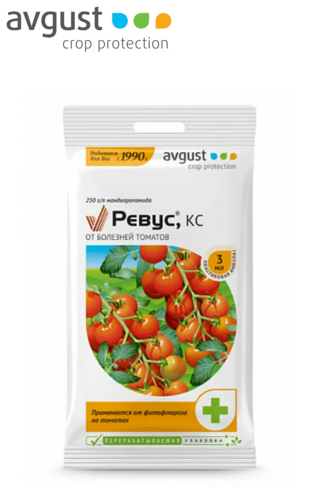РЕВУС - уникальный препарат от фитофтороза на овощных культурах. Обладает повышенной дождеустойчивостью, не смывается осадками уже через час после опрыскивания. Характеризуется длительной защитой вновь образующейся ткани листа, благодаря трансламинарному перемещению и лечебной активности. Улучшает показатели хранения урожая. Не токсичен для растений в рекомендуемых нормах. Действующее вещество: 250 г/л мандипропамида. Применение Опрыскивание в период вегетации: первое – профилактическое, последующие – с интервалом 7-14 дней. Норма разведения: 3мл/2,5 л воды. Расход: 2,5 л/50 кв. м. Количество обработок - 4. Срок до сбора урожая - 5 дней. Производитель: Сингента Кроп Протекшн, Швейцария.
