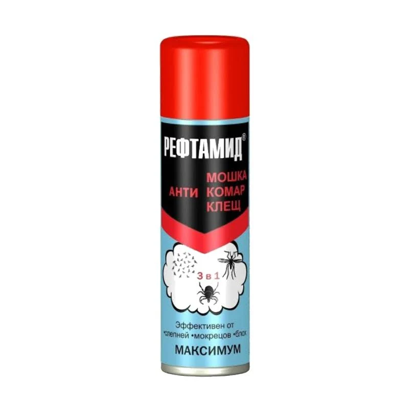 Аэрозоль 3 в 1 Рефтамид Максимум, мошка, антикомар, клещ, 147 мл - эффективное средство для защиты от комаров, мошки, лесных и таежных клещей. Также эффективен от слепней, мокрецов и блох. В составе средства – ДЭТА 28% и ванильная отдушка, усиливающая его действие. Аэрозоль наносится на одежду и кожу, действует до 4-5 часов.