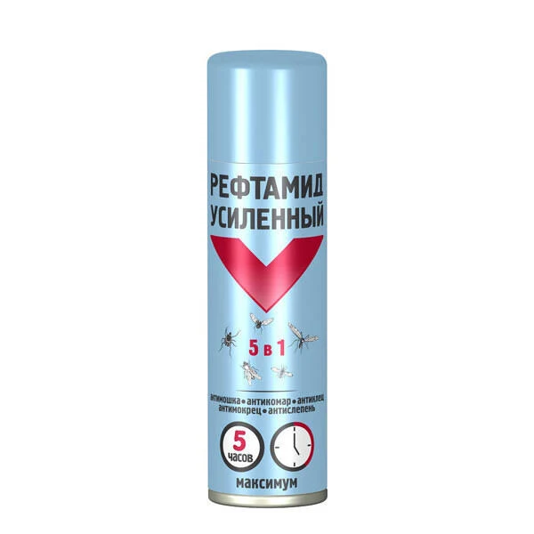 Рефтамид УСИЛЕННЫЙ Максимум — репеллентное средство для эффективной борьбы с кровососущими насекомыми. В его состав входят увеличенные количества действующих веществ, обеспечивающие более длительную (5 часов) и надёжную защиту от комаров, мокрецов, москитов, мошек, слепней, блох, а также от таёжных и лесных клещей.
