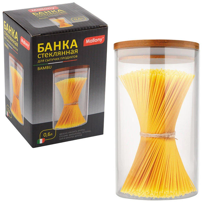 Стеклянная банка для сыпучих продуктов с крышкой из бамбука (прокладка из силикона) линейка - BAMBU, объем: 0,6 л, размер - 9,6*13 см тм Mallony Материалы - боросиликатное стекло, бамбук, силикон. Коэффициэнт линейноо расширения - (3.3?0.1)?10-6/K Упаковка: цветная коробка.