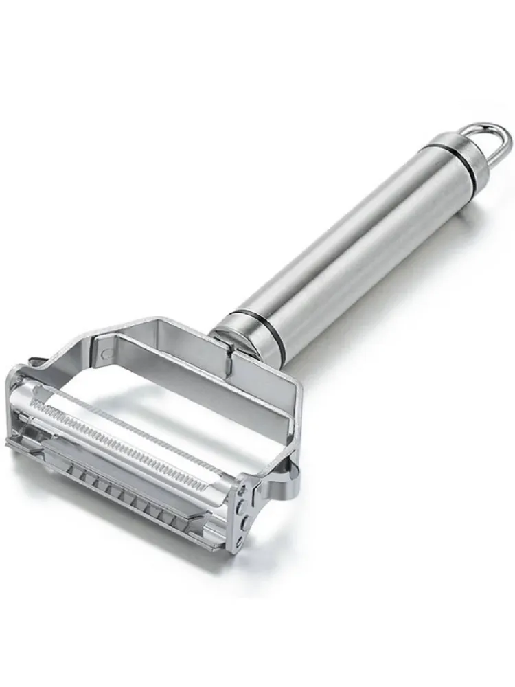 Овощерезка/Овощечистка-это устройство, которое может нарезать, так и очищать овощи и фрукты. Очень острые зазубренные края лезвия нарежут продукт мелкой соломкой для приготовлении блюд, салатов и украшения их. С одной стороны гаджета находится лезвие для очистки от кожуры, а с другой-лезвия для нарезки соломкой. Эта функциональная особенность очень удобна в использовании. Один предмет для выполнения различных функций. Купив овощечистку, вы оцените удобство и качество этого изделия. Она будет хорошим помощников вам в приготовлении блюд.