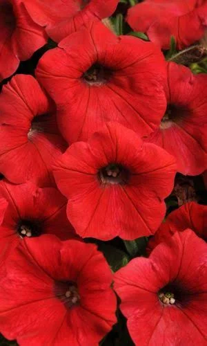 Ампельная обильноцветущая петуния. Стебли свисающие, гибкие, длиной 35-40 см, равномерно усыпаны огромным количеством красных цветков 6-8 см. Цветение раннее и продолжительное, с мая до окончания сезона. Растения прочные, хорошо переносят воздействие дождя и ветра, не теряя