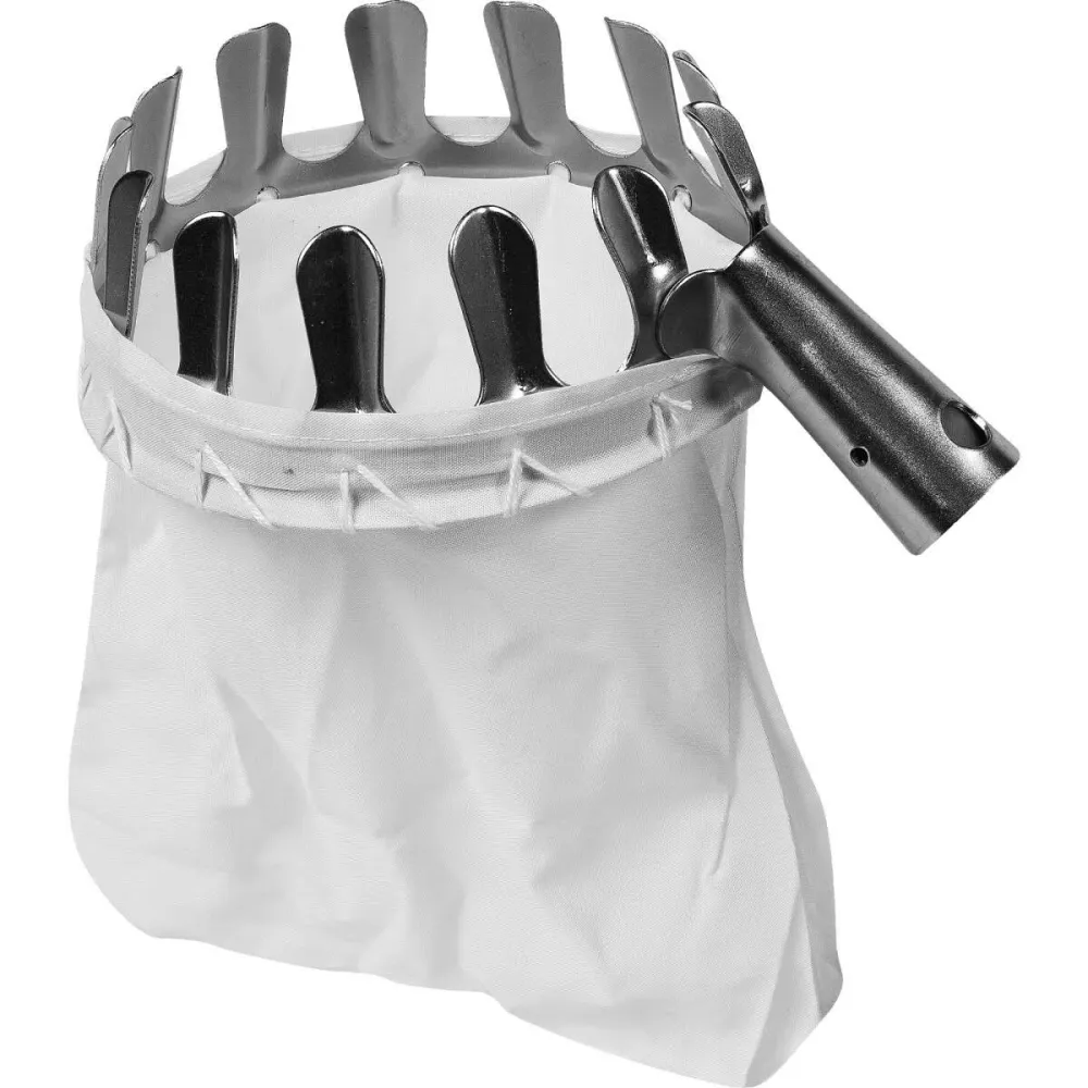 Плодосъёмник с тряпичным мешочкомпредставляет собой металлическое кольцо со специальными лепестками, которые выполняют функции ножа, отделяя плодоножку от ветви. Внизу имеется мешок из хлопчатобумажной ткани, что позволяет собирать одновременно несколько плодов. Устройство предназначено для сбора фруктов на большой высоте — к плодосъемнику можно присоединить ручку необходимой длины.