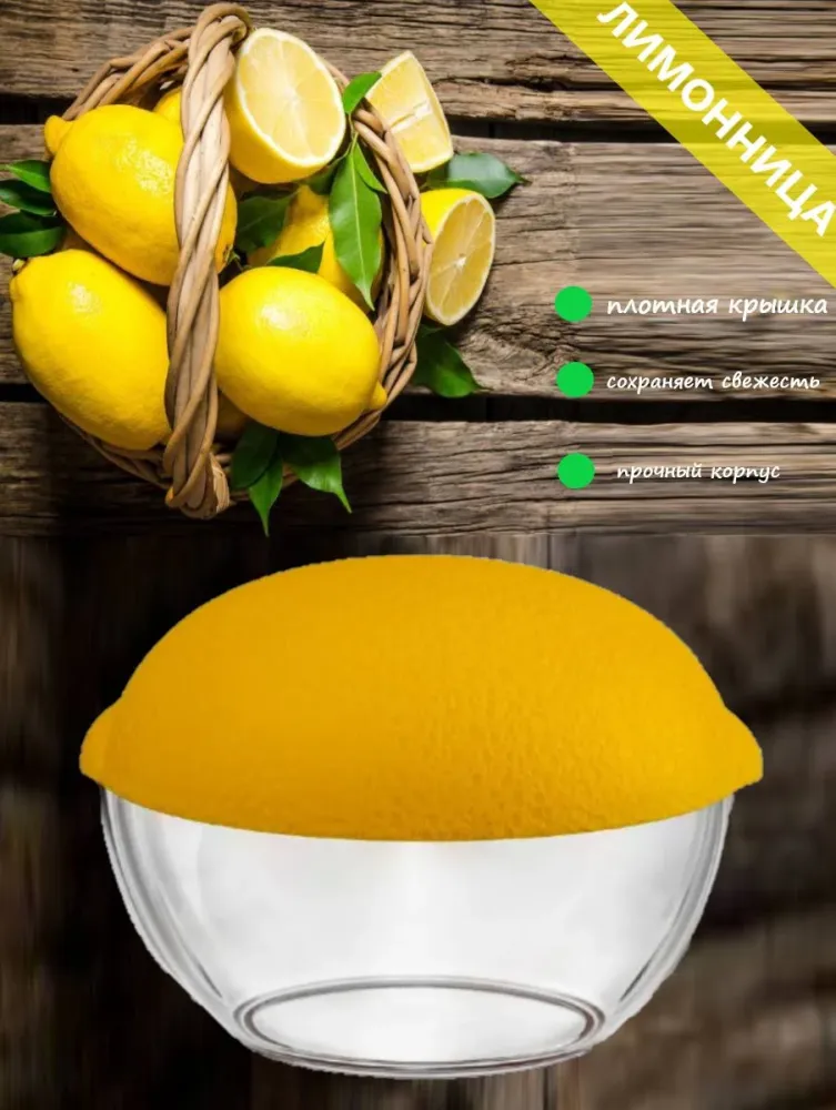 Емкость состоит из прозрачного корпуса и крышки, которая повторяет форму и фактуру лимона.Крышка защищает от высыхания и доступа кислорода, что обеспечивает сохранение первоначального качества продукта.Стенки прозрачного корпуса позволяют легко увидеть содержимое контейнера. Емкость компактна и не занимает много места.Материал – безопасный пищевой пластик. Изделие соответствует ГОСТ Р-50962-96.
