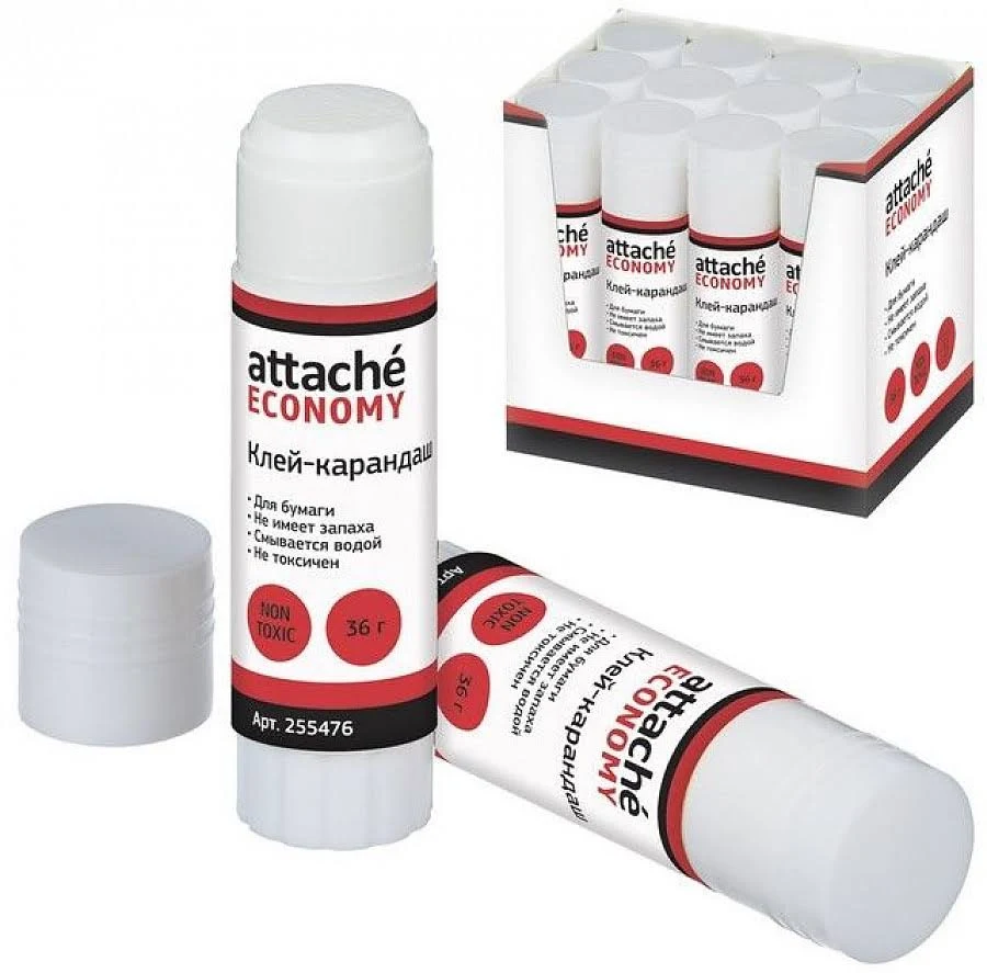 Клей-карандаш Attache Economy предназначен для склеивания бумаги, картона. Вес — 36 г. Круглая форма корпуса. Не содержит цветовых пигментов (бесцветный). Состав клея: ПВА. Моментально склеивает бумагу уже через 15 секунд, после нанесения клея. Легко смывается водой и отстирывается, не имеет запаха, быстро высыхает. Товар относится к ценовому сегменту «суперэконом». Имеет упрощенные характеристики и более простую упаковку. Отвечает основным требованиям потребления.