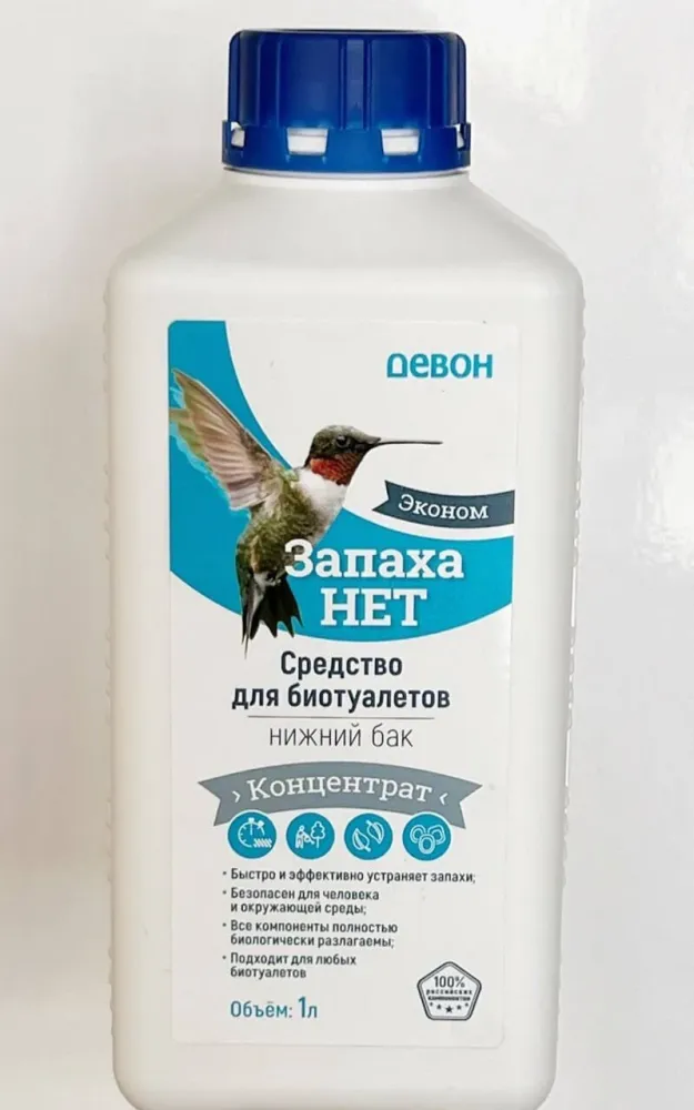 ЗАПАХА НЕТ для нижнего бачка биотуалета быстро и эффективно уничтожает фекальный запах, разжижает отходы. Обладает дезинфицирующим эффектом, экологически безопасно, сливы из биотуалета можно выливать в компост. Состав – водный раствор обычного азотного удобрения, ПАВ, краситель, отдушка. Расход - 30 - 50 г и 0,5 - 1 л воды на каждые 10 л приёмной ёмкости. 100% отечественных компонентов.