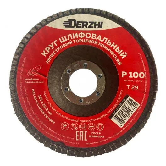 Круг Derzhi лепестковый торцевой, конический, 125х22,2 мм, Р100 отлично подходит для выполнения любых видов шлифовальных работ с конструкциями, деталями из жаропрочных сталей, чугуна, цветных металлов, твёрдых сплавов и минеральных материалов. Данный диск предназначен для подготовки поверхности к последующей работе с ней или для финальной обработки. Шлифовальный круг применяется при осуществлении финальной обработки поверхности, поэтому в нём применён самый мелкий абразив. . Арсеналтрейдинг.